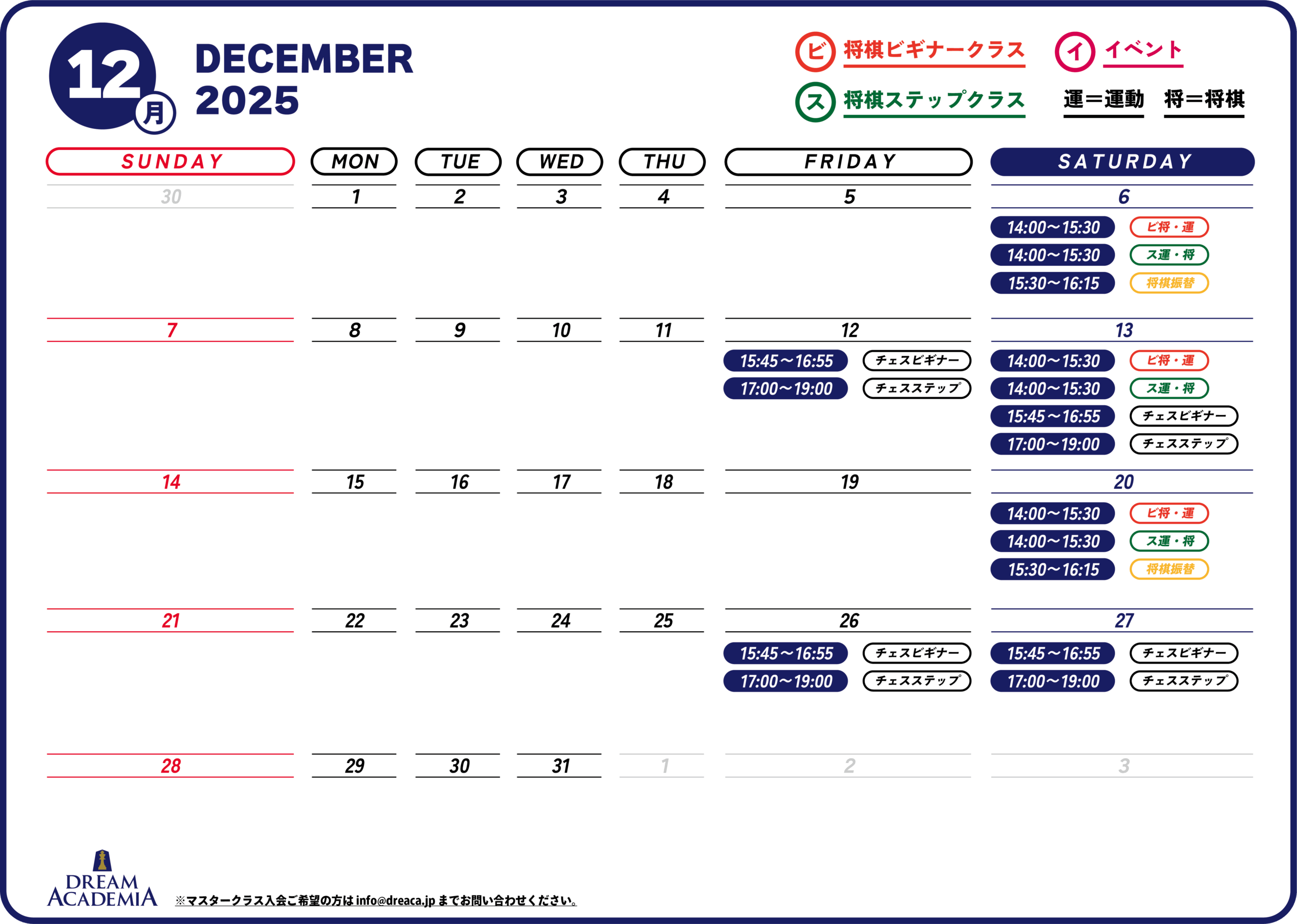 ドリームアカデミアの2025年12月スケジュールになります。
